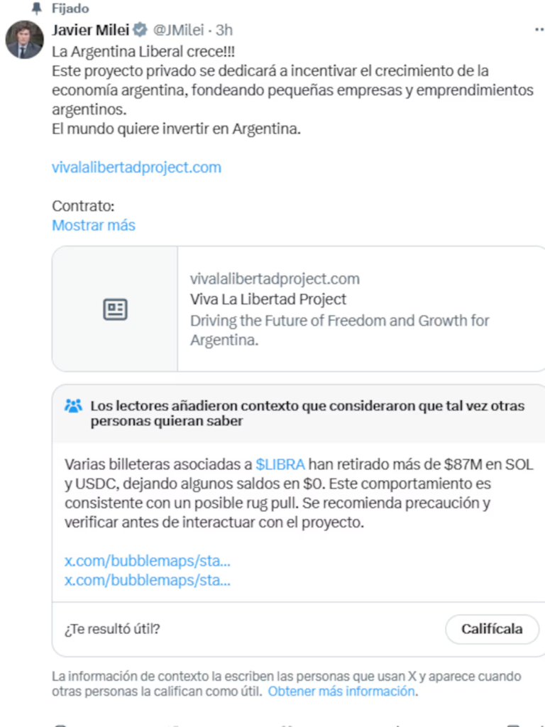 De acuerdo con el mensaje que había compartido en el posteo eliminado, el presidente resaltó: “El mundo quiere invertir en Argentina”, acompañando el mensaje con dos enlaces: uno al sitio web del proyecto y otro con el tag de la criptomoneda $LIBRA, la cual sería utilizada como medio de inversión.
