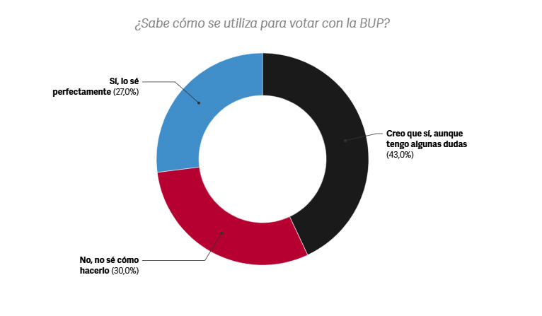 Además, «a pesar de los niveles de conocimiento reportados, solo el 27% de los encuestados se siente capacitado para votar con la BUP si las elecciones fueran hoy. La mayoría manifiesta dudas o considera que no sabría cómo hacerlo».